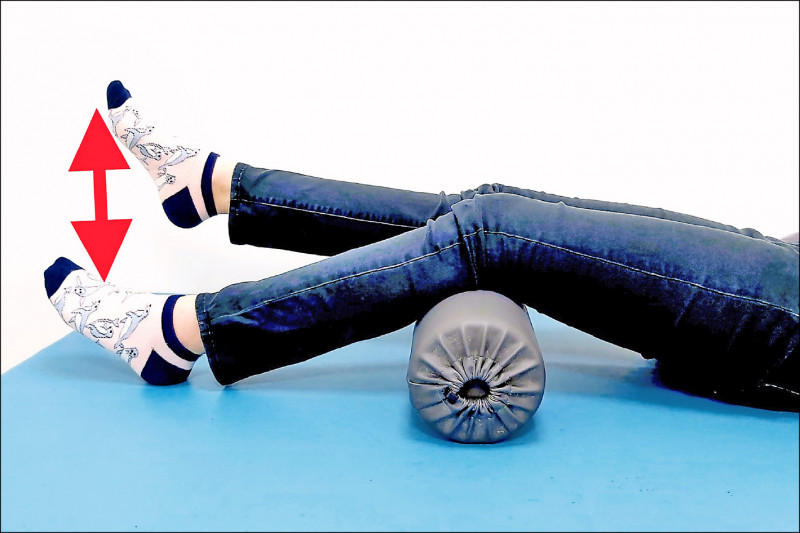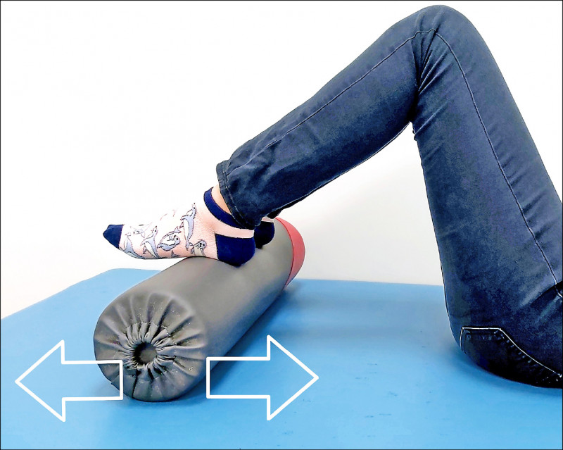 ●暖身期-伸展:雙腳踩在滾筒上,藉由滾筒的滾動性,讓兩側膝蓋彎曲與伸直約3至5分鐘(圖2),達到下肢關節伸展運動。